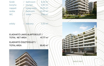 Eladó újépítésű, modern lakás Angyalföldön – kiváló áron! Eladó egy 50 m²-es újépítésű, szerkezetkész lakás Angyalföld frekventált részén, a Déva utcában! Várható átadás: 2026. nyara Méret: 47.77 m² + 5,33 m² erkély Fűtés-hűtés: mennyezeti hűtő-fűtő rendszer További lehetőség: 12,50 m² teremgarázs beálló opcionálisan megvásárolható 7,5 millió forintért. Társasház jellemzői: Nyolc emeletes, monolit vasbeton vázzal és vízzáró alapokkal. 25 cm vastag vasbeton födémek az emeletek között. Külső fal: 30 cm + 15 cm polisztirol hőszigetelés + 5 cm EPS kiegészítő szigetelés. Lakások között 25 cm vastag akusztikus tégla fal. Műanyag, kétszeres üvegezésű nyílászárók. Beltéri padló: 8 mm laminált parketta és kerámia burkolat. Fehérre festett belső falak. Elektromos hálózat: 3×16 A Társasház szolgáltatásai: -Kaputelefonos és portaszolgálatos bejárat . -Két 13 személyes lift. -Igényes kialakítású lépcsőház. Lakás elhelyezkedése és adottságai: -Első emeleti, dél-keleti fekvés, belső udvarra néző. -Ívelt terasz, zöld, gondozott belső udvar. -Elrendezés: előszoba, fürdőszoba, konyha, nappali, hálószoba, WC, terasz. Elhelyezkedés: -Lehel tér közeli, frekventált, de csendes környék. -Bevásárlóközpontok, piac, gyógyszertár, iskola és óvoda a közelben. Duna-part sétatávolságra Kiváló közlekedés: busz, villamos, troli, illetve könnyű autós megközelítés a belváros felé. Fizetés, átadás és hitel részleteiről telefonon adok bővebb tájékoztatást. Ha felkeltette az érdeklődését, akkor keressen bizalommal! English Version Newly Built, Modern Apartment for Sale in Angyalföld – Excellent Price! A 50 m², newly built, shell and core apartment is for sale in a prime area of Angyalföld, located on Déva Street. Estimated handover: Summer 2026 Size: 47.77 m² + 5.33 m² balcony Heating & cooling: ceiling-mounted cooling and heating system Additional option: Underground parking space (12.50 m²) optionally available for HUF 7.5 million. Building Specifications -Eight-storey building with monolithic reinforced concrete frame and waterproof foundation. -25 cm thick reinforced concrete slabs between floors. Exterior wall: 30 cm + 15 cm polystyrene insulation + 5 cm EPS additional insulation. -25 cm acoustic brick walls between apartments. -Double-glazed plastic doors and windows. -Interior floor coverings: 8 mm laminated flooring and ceramic tiles. Interior walls painted white -Electrical network capacity: 3×16 A Building Amenities -Secure entrance with intercom and concierge service. -Two elevators, each suitable for 13 persons. -High-quality, elegant staircase design. -Apartment Features. Located on the 1st floor, facing south-east Overlooking the landscaped inner courtyard, with a curved terrace Floor plan includes: entrance hall, bathroom, kitchen, living room, bedroom, WC, terrace. Location & Surroundings Close to Lehel Square, a well-connected yet quiet area. Nearby facilities: shopping centers, market, pharmacy, school, kindergarten. . The Danube riverfront is within walking distance. Excellent public transport access: bus, tram, trolleybus + easy car access to downtown. For details regarding payment schedule, handover, or financing options, please contact me by phone. If this property matches your needs, feel free to call me anytime